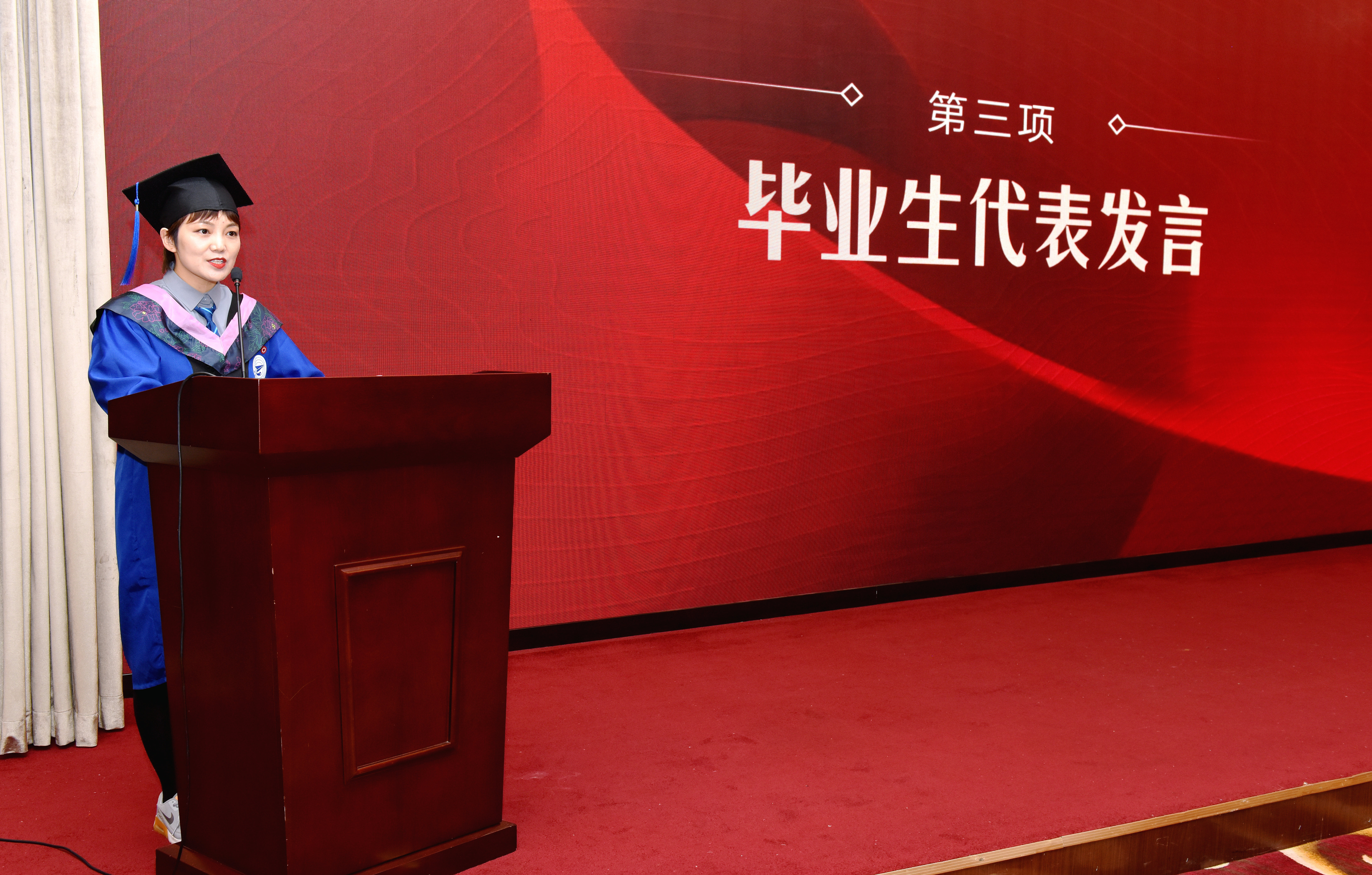 常玉老师作为导师代表,祝贺同学们克服学习与工作冲突,用坚韧不拔的毅力和勇气收获了辛勤耕耘后的喜悦与成长。师恩难忘,毕业生代表为导师代表献上鲜花表达感恩与祝福。