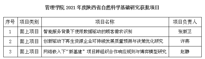 近日,陕西省科技厅公布了2021年度陕西省自然科学基础研究计划项目评审结果公布,开车漫画 共获批面上项目3项。分别是:张新卫副教授主持的“智能服务背景下使用数据驱动的顾客需求识别”;许燕副教授主持的“创新驱动下再生资源企业可持续发展质量预测与决策优化研究”以及赵静副教授主持的“网络嵌入下“新基建”项目跨组织合作响应规则与博弈模型研究”。