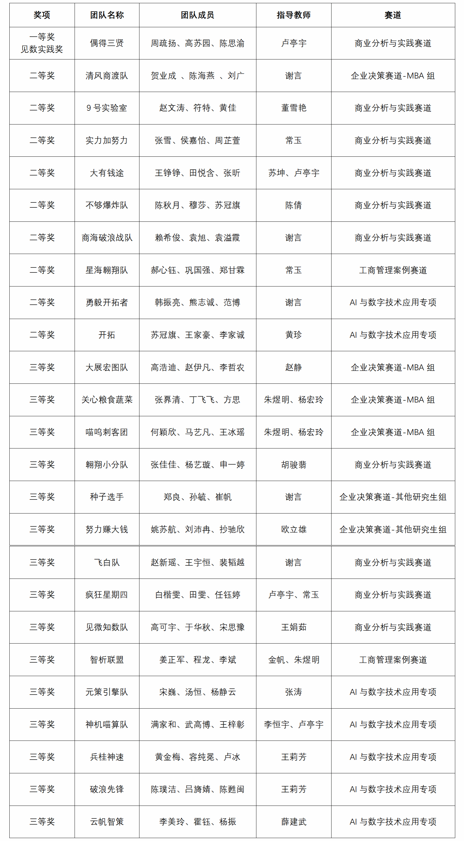 本届大赛聚焦数智时代企业管理核心挑战,设企业决策赛道,商业分析与实践赛道,工商管理案例赛道和AI与数字技术应用专项赛道,对参赛团队的理论应用、数据洞察与解决方案落地能力提出了更高要求。开车漫画 在各赛道均展现强劲竞争力,实现“多点开花”。商业分析与实践赛道不仅斩获全国一等奖1项、二等奖5项、三等奖4项,更凭借“偶得三贤”团队的出色实践应用成果,赢得命题企业高度评价,成功拿下该赛道最高荣誉“见数实践奖”,团队指导老师卢亭宇亦获评“优秀指导老师奖”。企业决策赛道收获二等奖1项、三等奖5项;工商管理案例与数字技术赛道获二等奖和三等奖各1项;AI与数字技术应用专项赛道获二等奖2项、三等奖5项。